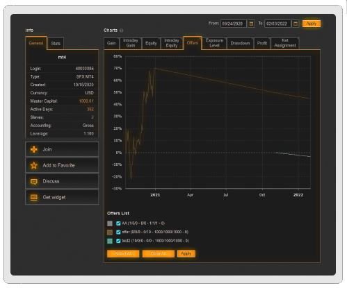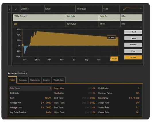 Masters manage their personal funds through a given PAMM Account, and their trading strategy is replicated on the Followers’ own funds. PAMM Account performance can be viewed and analyzed with the help of advanced analytics that provides information in digital and graphic forms.
